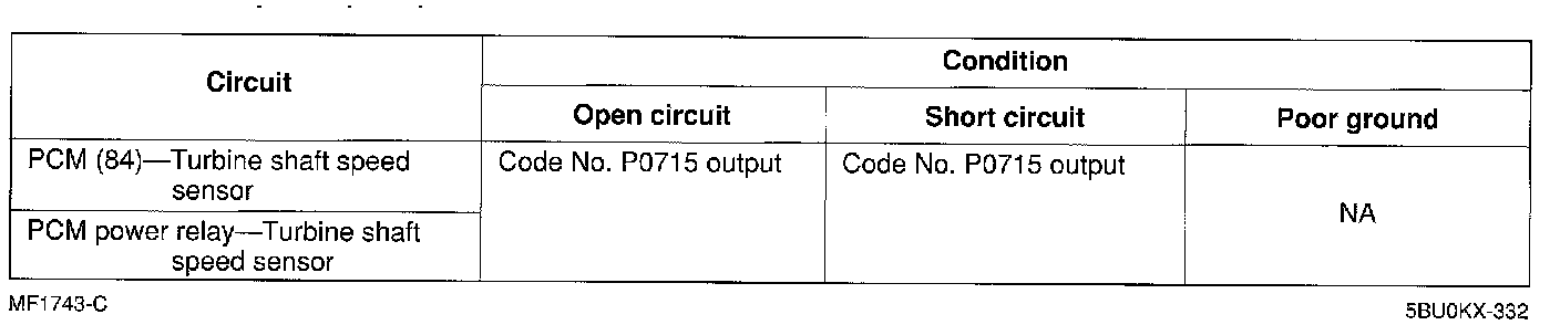 ^ If the turbine shaft speed sensor has an open or short, Diagnostic Trouble Code No. P0715 is output.