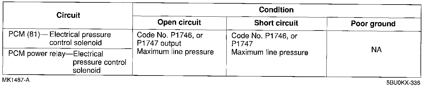 ^ If the electrical pressure control solenoid or circuit has an open or short, Diagnostic Trouble Code No. P1746 or P1747 is output.