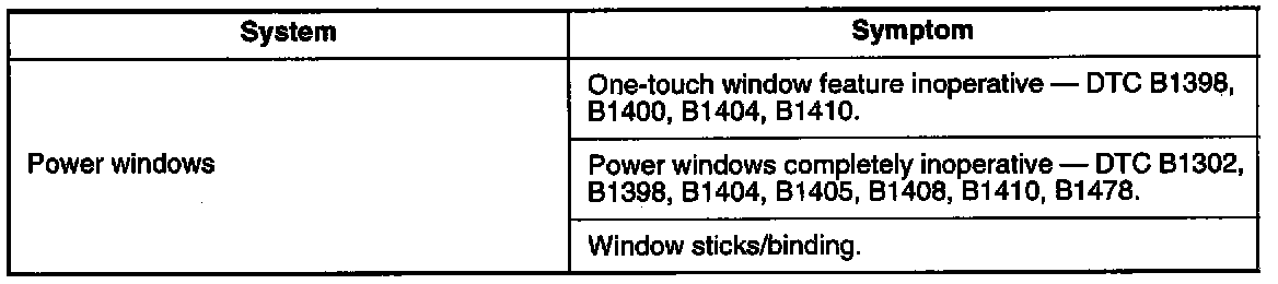 Power Window System Troubleshooting Index