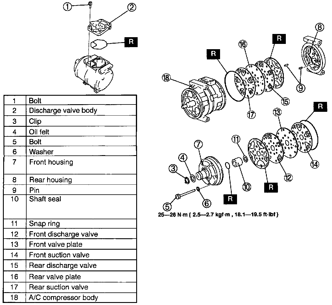 4. Fill the A/C compressor with the same amount of ND-OIL8 compressor oil as was drained before disassembly.