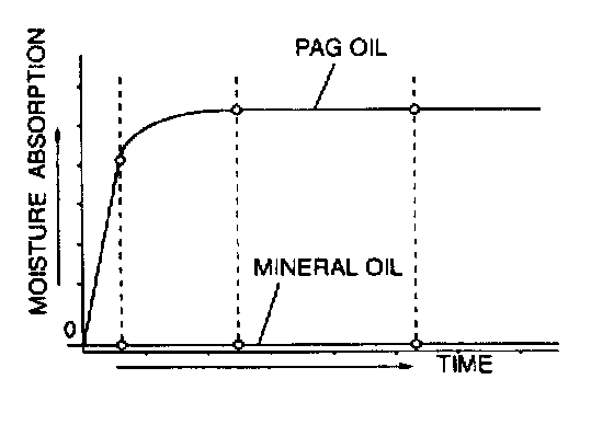 - PAG oil has a higher moisture absorption efficiency than the previously used mineral oil. If moisture mixes with the compressor oil, the refrigerant system could be damaged. Therefore, install caps immediately after using the compressor oil or removing refrigerant system parts to prevent moisture absorption.