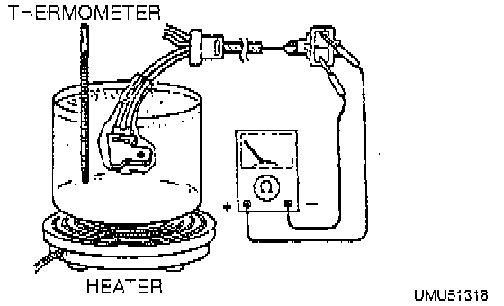1. Remove the transmission fluid temperature sensor.2. Place the transmission fluid temperature sensor in water with a thermometer as shown and heat the water gradually.