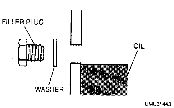 Verify that the oil is up to the brim of the filler plug hole, as shown.