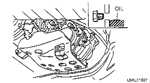 5. Add the specified oil through the filler plug port until the oil rises to the brim edge of the level plug hole.