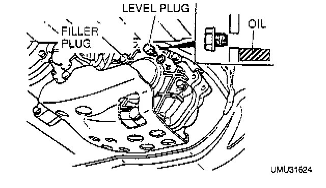 2. Verify that the oil is up to the brim of the level plug hole as shown. If it is low, add the specified oil through the filler plug port.