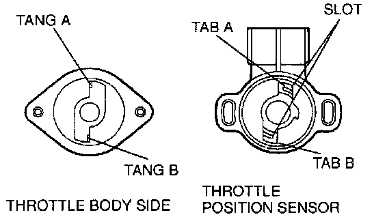 5. Open the throttle valve slightly and catch the tang of the throttle body on the throttle position sensor plastic tabs. Align tang A on throttle body with tab A on throttle position sensor. Note tangs on the throttle body mate with the tab on the throttle position sensor on the side of the tab without a slot.