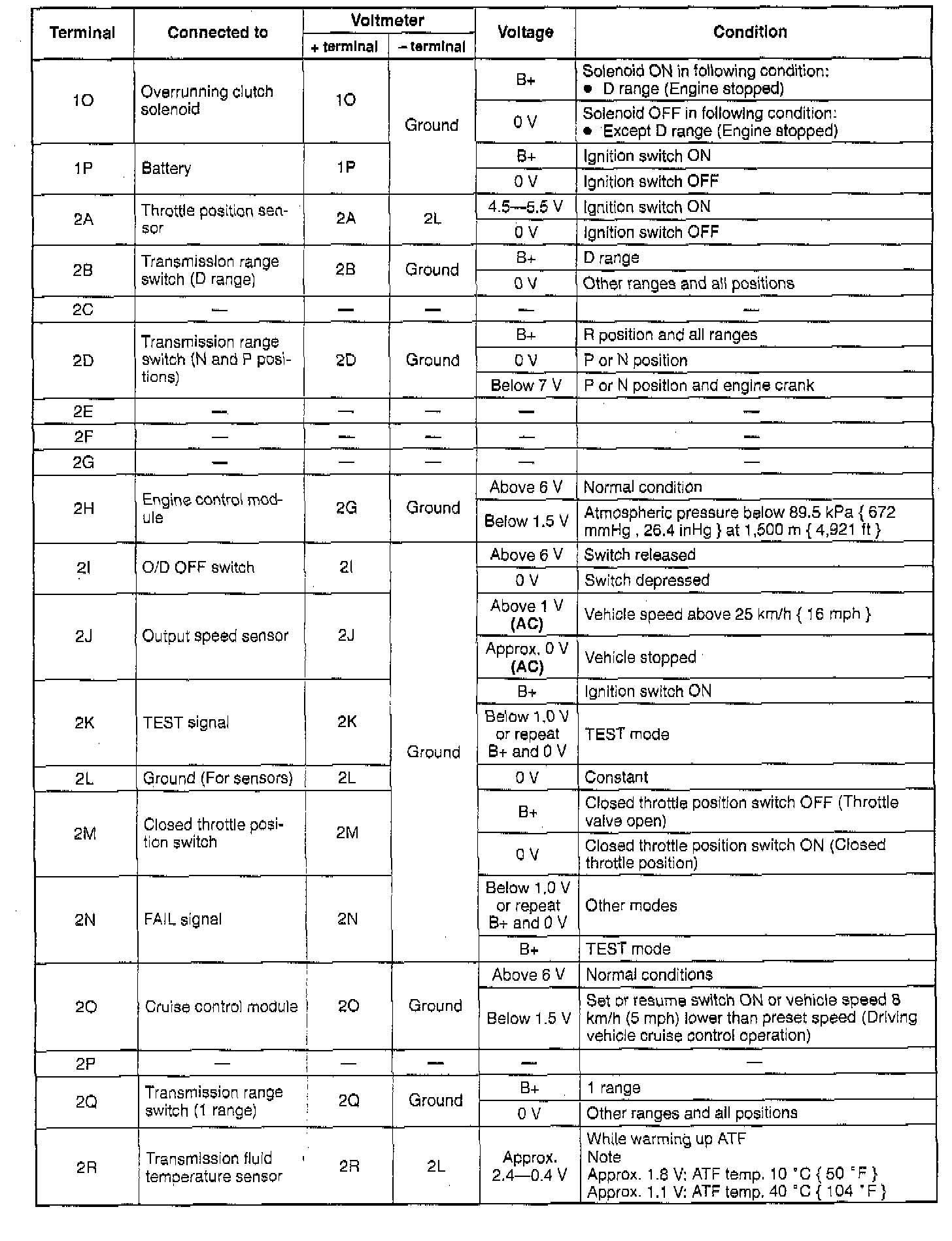 1. Turn the ignition switch to ON, and check the transmission control module terminal voltage, referring to the Terminal Voltage Chart illustrated.