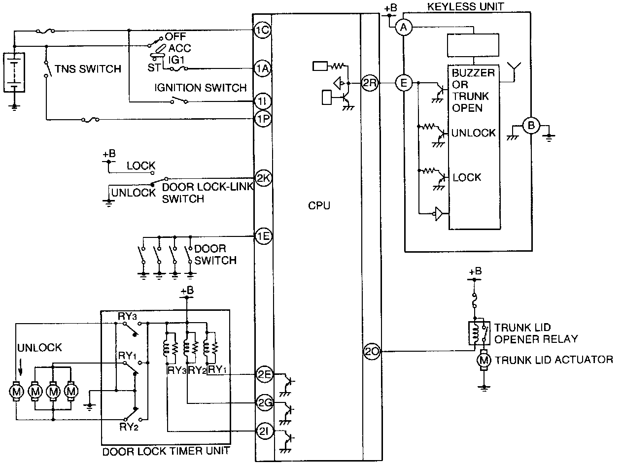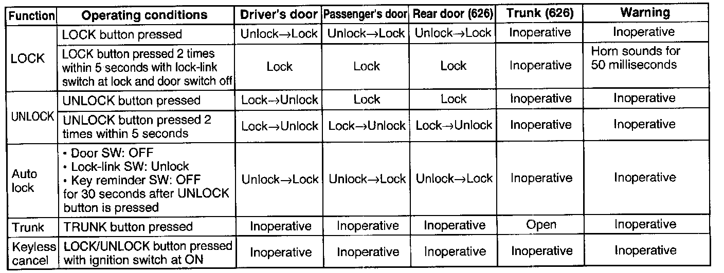 The operation of the keyless entry system is outlined in the table above. The system operates when the ignition switch is not at ON.