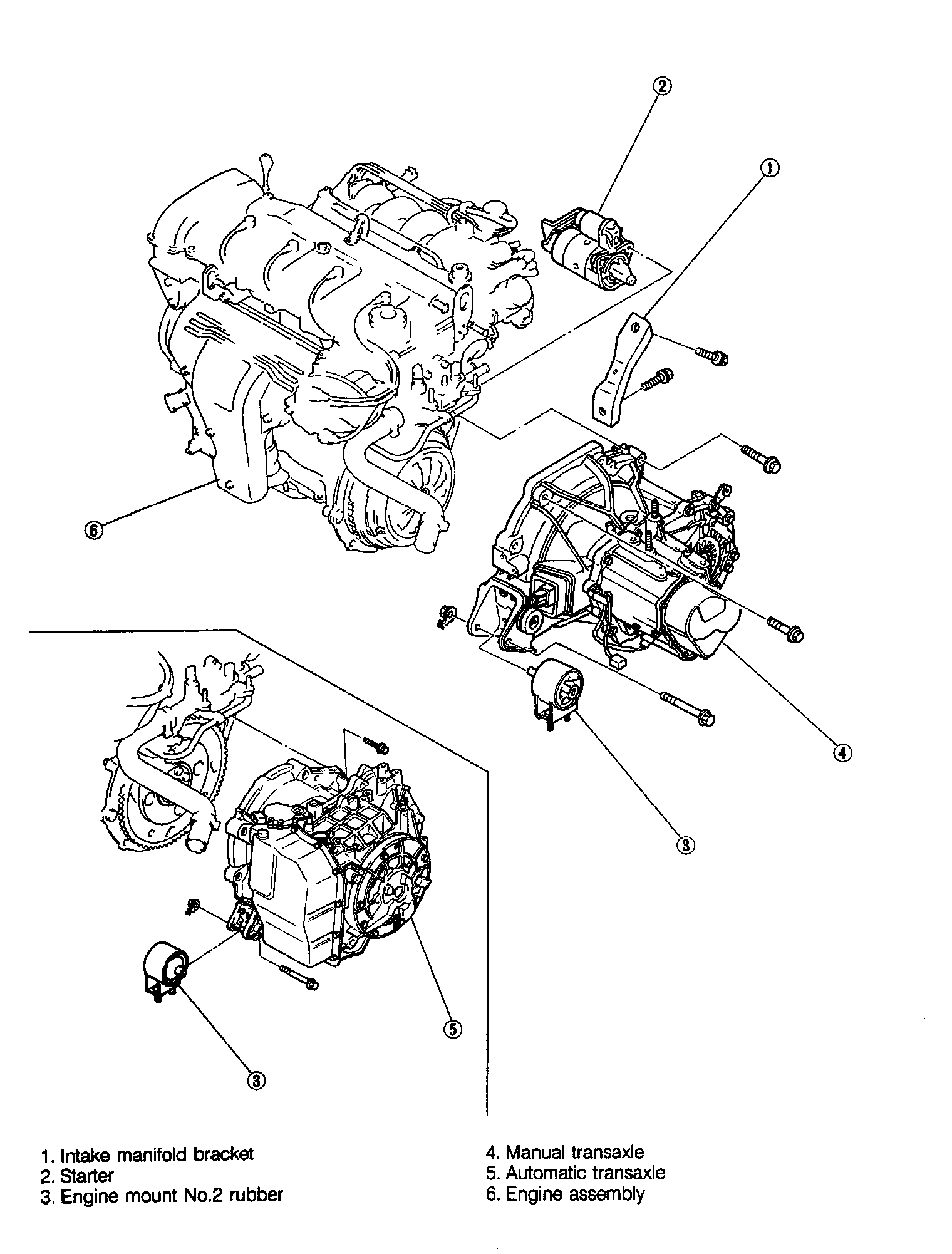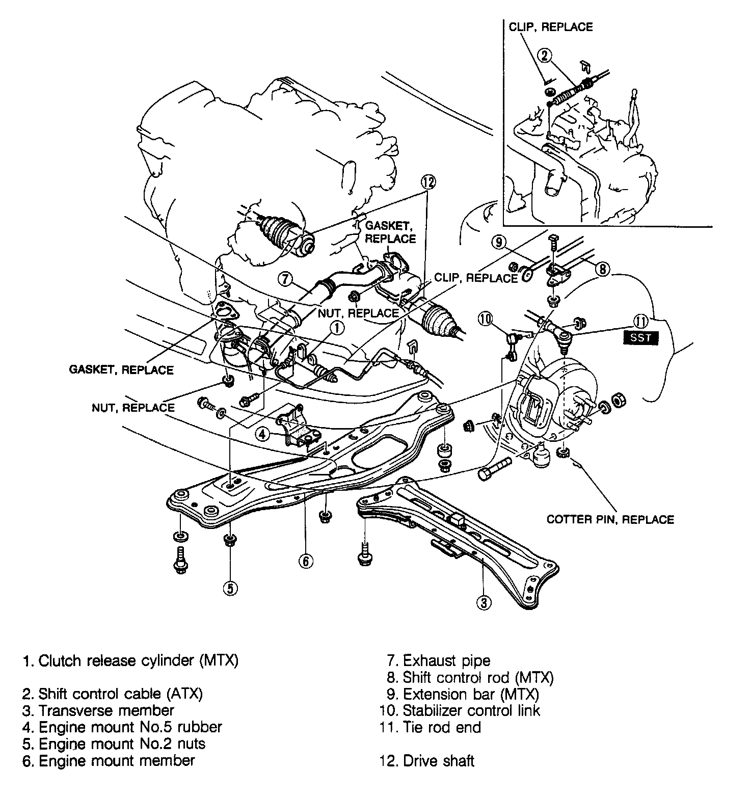 3. Remove the engine mount member bolts and nuts and re move the engine mount member.