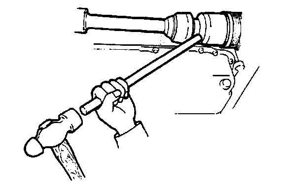4. As shown in the figure, insert a pry bar between the drive shaft and the joint shaft and tap on the bar to uncouple them. (Right side)