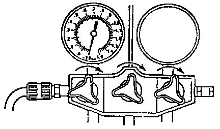 9. Verify that the high- and low-pressure side readings of the manifold gauge are at -101kPa {-760 mmHg, -29.9 inHg}. Close each valve of the gauge set.