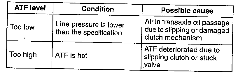 NOTE: If the ATF level is too high or too low in hot condition, the following problems may be the cause.