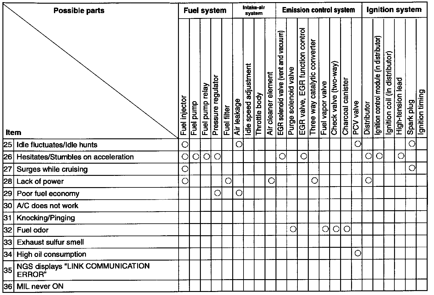 NOTE: These Quick Diagnosis Charts show the relationship between troubleshooting items and inspection points.