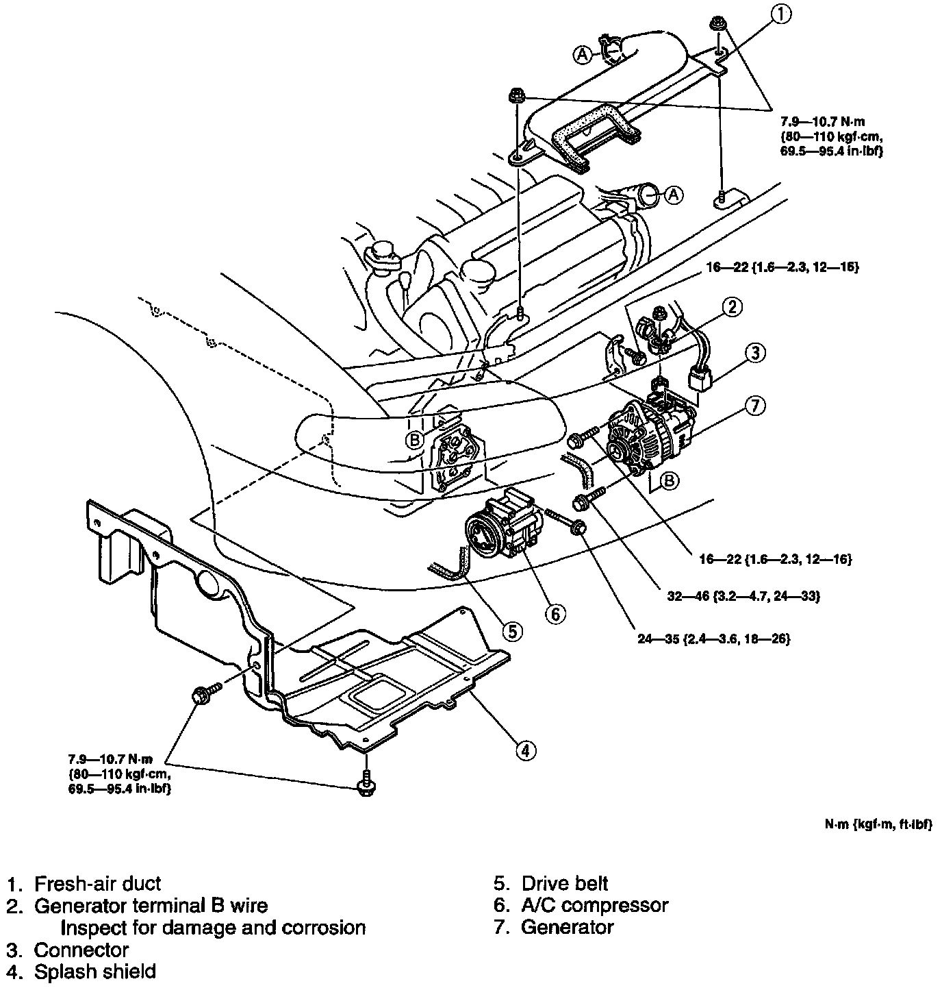 ^ When the battery cables are connected, touching the vehicle body with generator terminal B will generate sparks. This can cause personal injury, fire, and damage to the electrical components. Always disconnect the battery before performing the following operation.