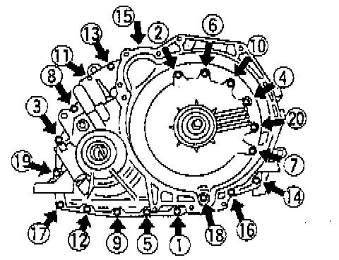 103. Install the twenty converter housing-to-transaxle case bolts or replace bolts. Tighten the bolts in the sequence shown to 20 - 25 Nm (15 - 18 ft. lbs.).