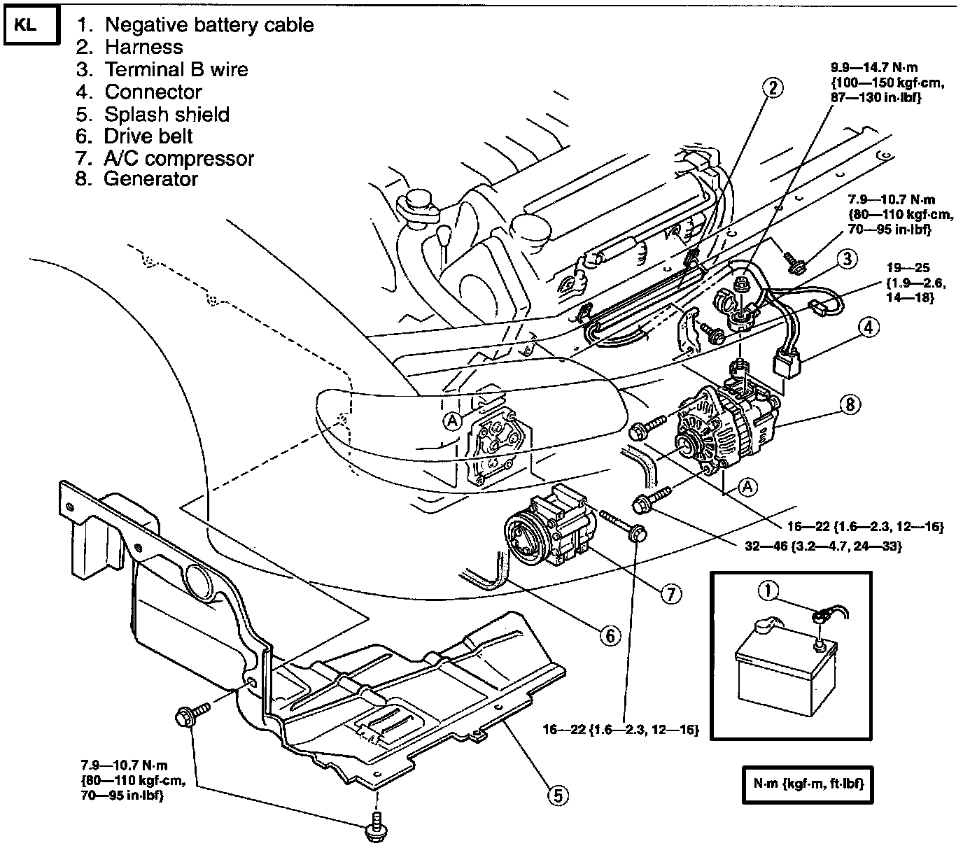 ^ Disconnecting generator terminal B before disconnecting the negative battery cable can damage the generator harness and connector.
