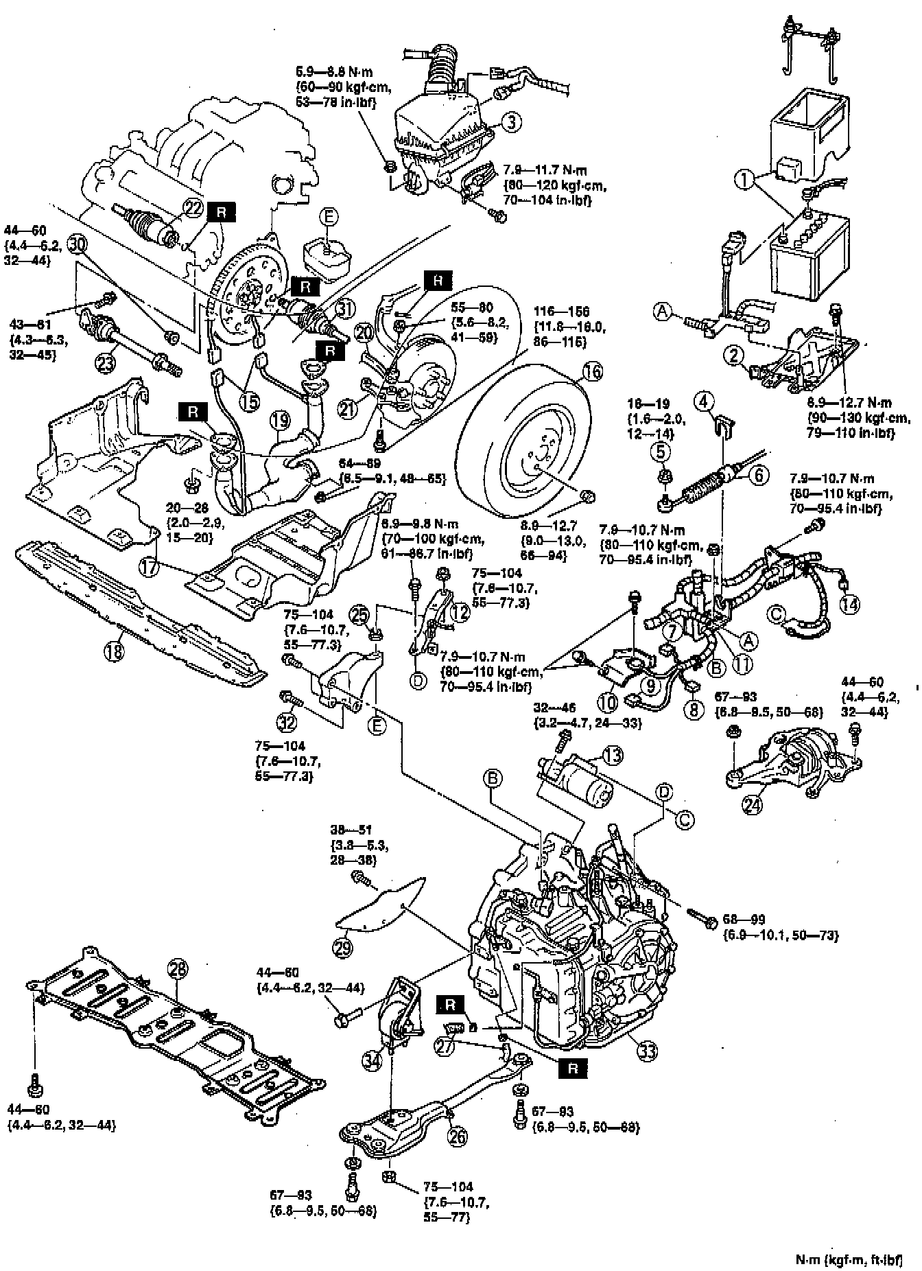 2. Install the transaxle mounting bolts and tighten to 68 - 99 Nm (50 - 73 ft. lbs.).