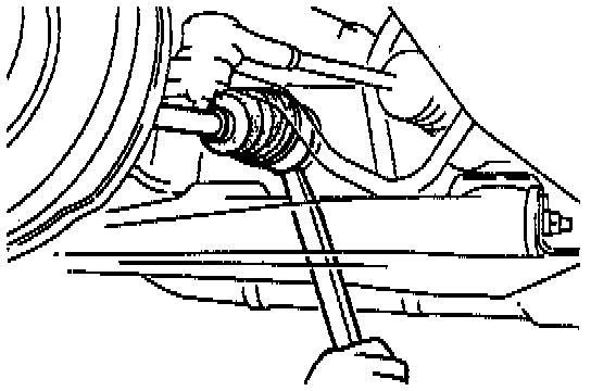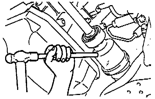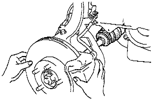 3. Separate the left-side drive shaft from the transaxle by prying with a bar inserted between the outer ring and the transaxle, as shown in the illustration.