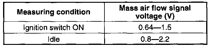5. If not as specified, inspect the harness and connector between the mass air flow sensor and the PCM terminal.