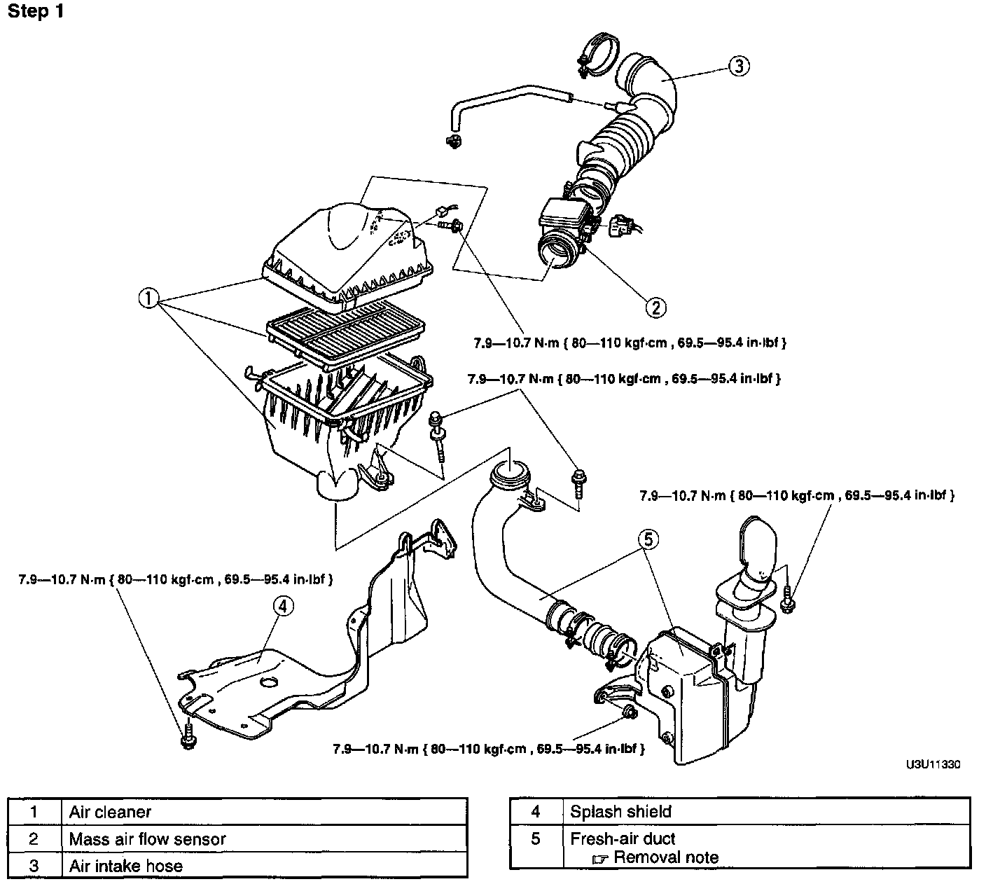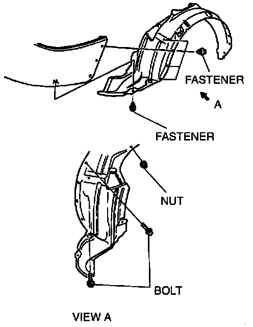 NOTE: Before removing the fresh-air duct, remove the LH front mud guard mounting bolts, nut, and fasteners shown.