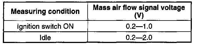 5. If not as specified, inspect the harness and connector between the mass air flow sensor and the PCM terminal.
