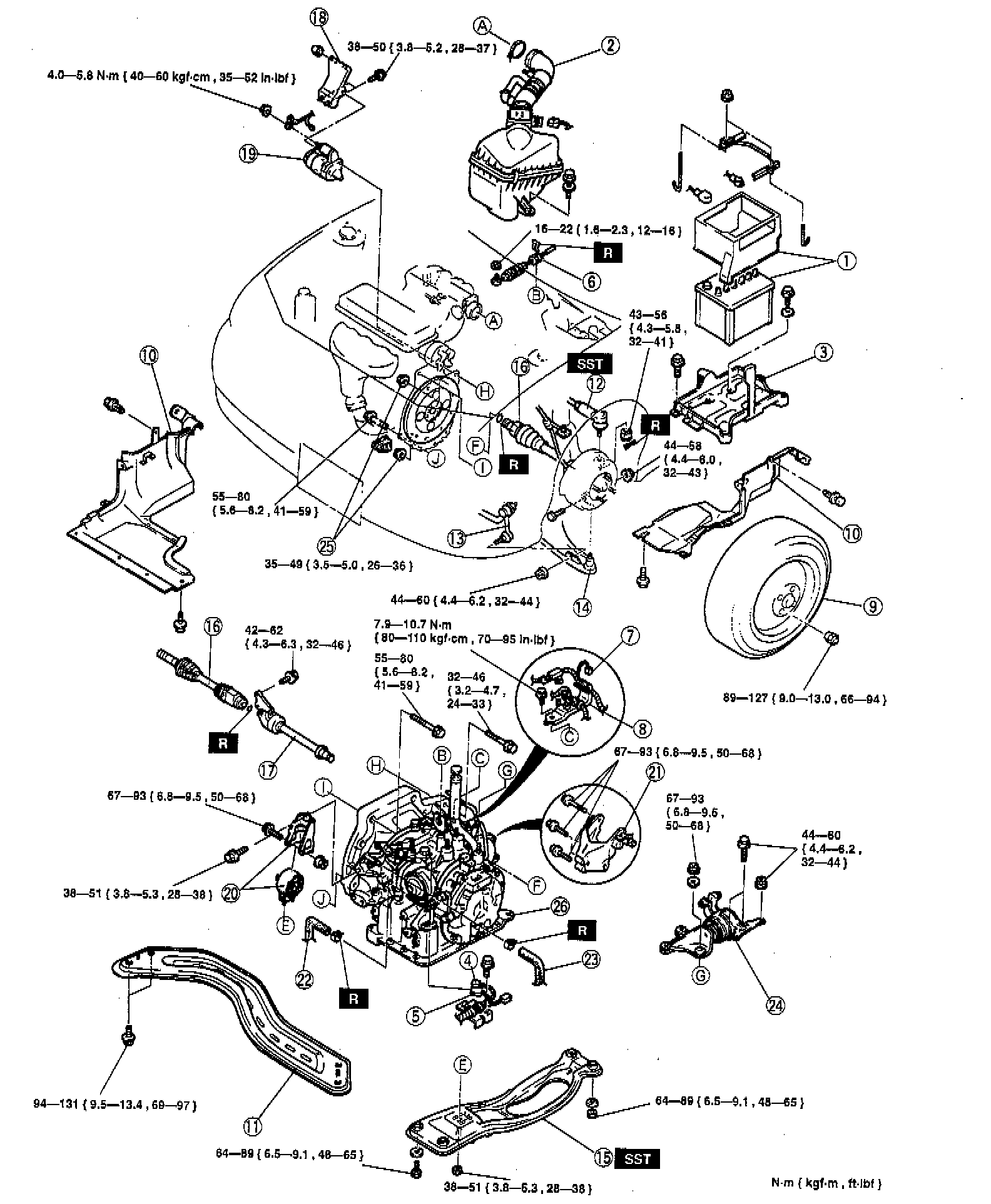 4. Tighten the nuts of transaxle side to 67 - 93 Nm (50 - 68 ft. lbs.).