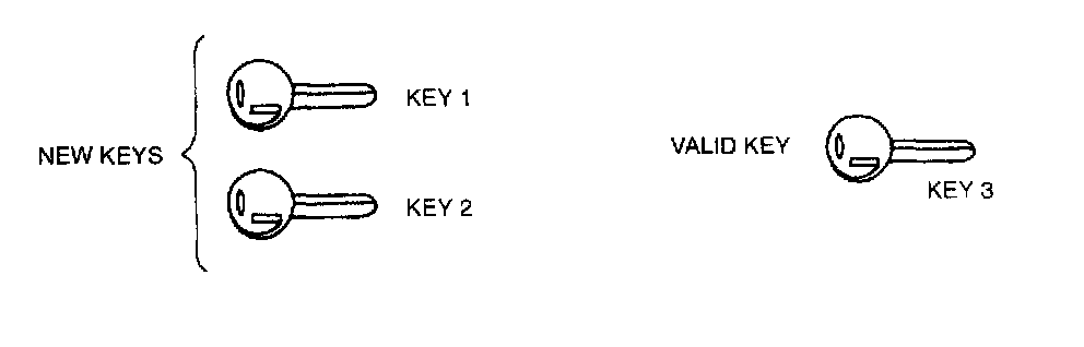 4. Using key 2, turn ignition switch to ON then back to LOCK six times. Key should not remain ON or LOCK for more than one second. It is particularly important to ensure that the 6th turning is done within 1 second.