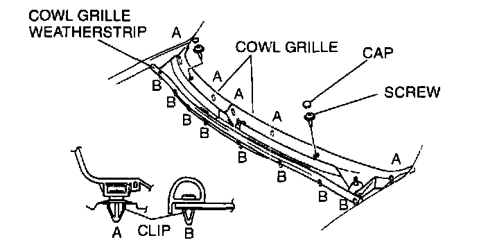 1. Remove the windshield wiper arm and blade.2. Pull the cowl grille weatherstrip to disengage clips B from the body.