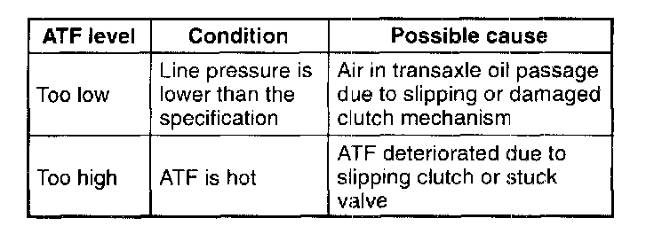 NOTE: If the ATF level is too high or too low in hot condition, the following problems may be the cause.