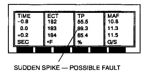 Notice the major jump in the TP voltage while scrolling through the information. This example would require a smooth and progressive throttle pedal travel during a key ON and engine OFF mode.