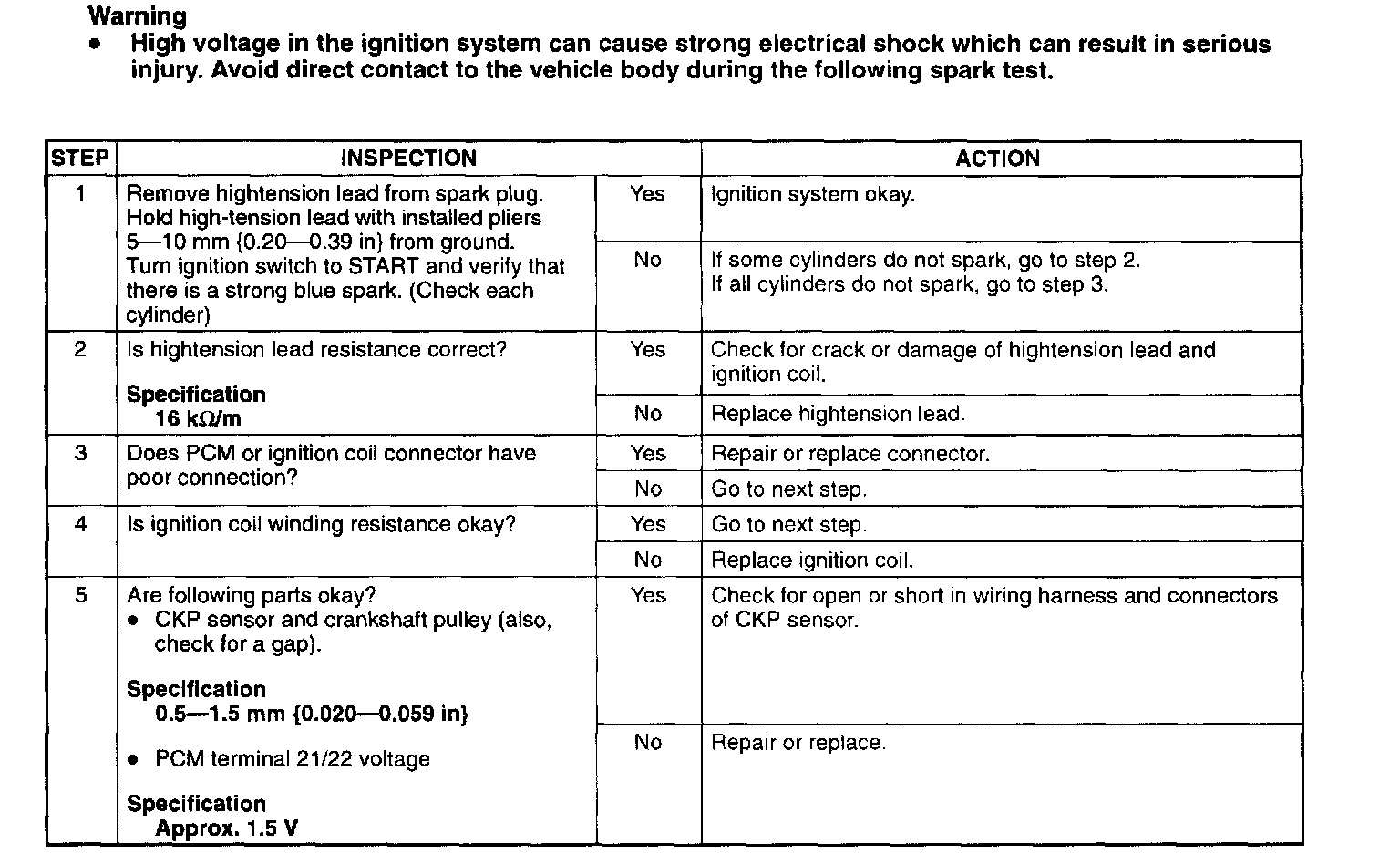 WARNING: High voltage in the ignition system can cause strong electrical shock which can result in serious injury. Avoid direct contact to the vehicle body during the following spark test.