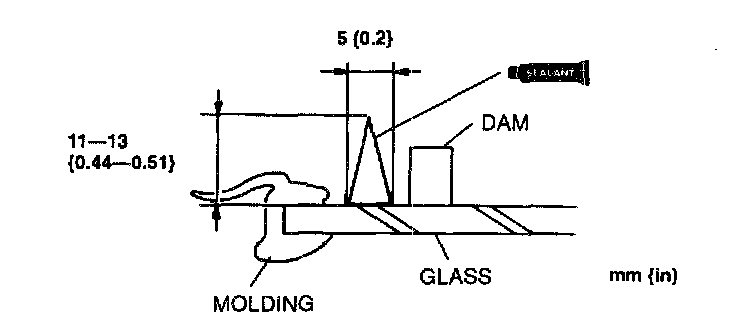 10. Once the primer is dry, apply sealant around the entire circumference to fill the gap between the dam and the edge of the molding with a 11-13 mm (0.44-0.51 in) high 5 mm {0.2 in} wide bead of sealant. Apply sealant beside the molding.