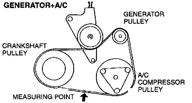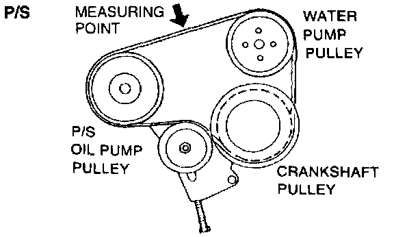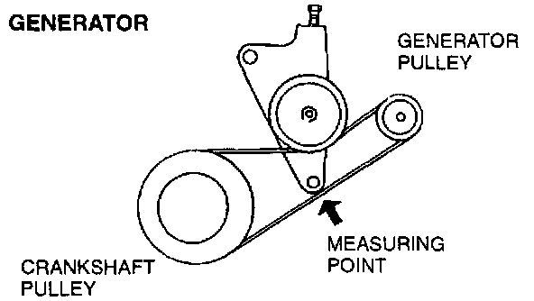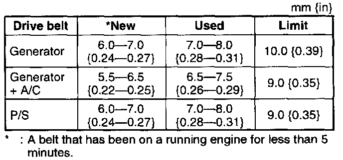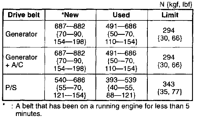 1. Verify the drive belt deflection when the engine is cold, or at least 30 minutes after the engine has stopped. Apply moderate pressure 98 N {10 kgf, 22 lbs.} midway between the specified pulleys.