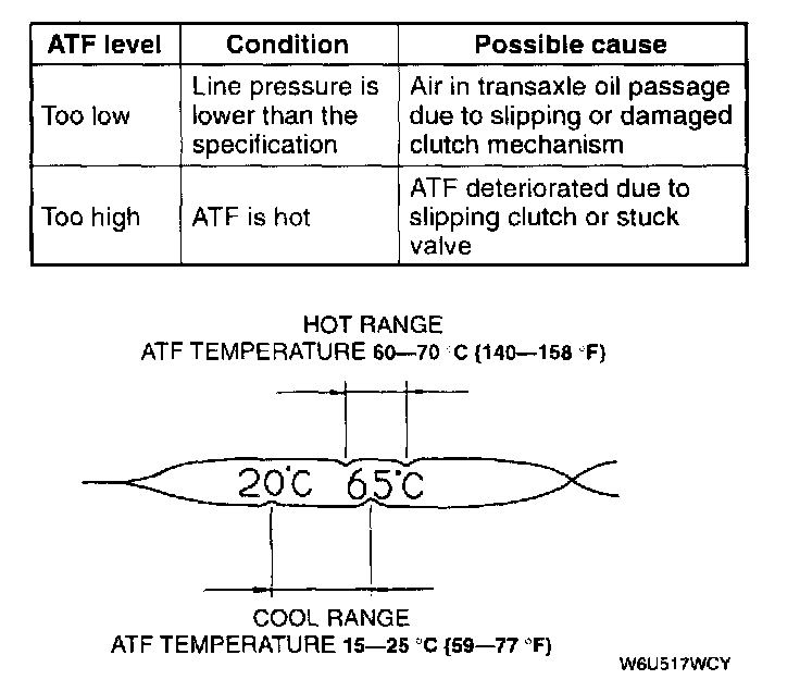 NOTE: If the ATF level is too high or too low in hot condition, the following problems may be the cause.