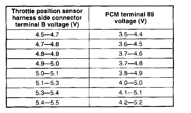 (8) When the throttle valve is at the wide open throttle, verify that the PCM terminal 89 voltage is in the specification.