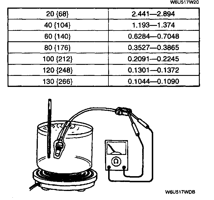 2. Place the transaxle fluid temperature sensor in ATF with a thermometer as shown and heat the ATF gradually. Do not allow the test pieces to touch the bottom.