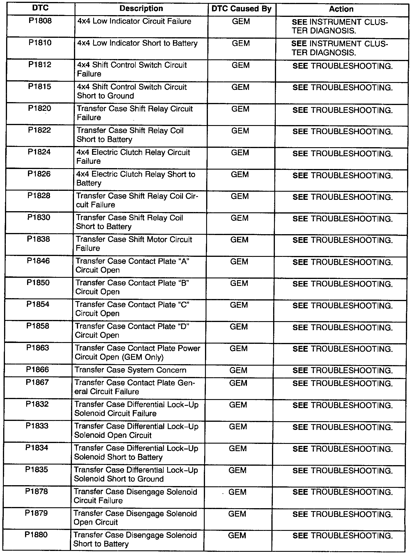 GEM/CTM Diagnostic Trouble Code (DTC) Index