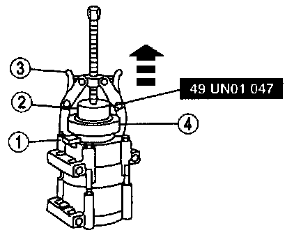 2. Install shaft protector tool 49 UN01 047 on the nose opening of the A/C compressor.
