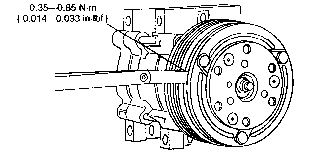 8. Measure and adjust the clutch air gap by removing or adding A/C clutch hub spacers.