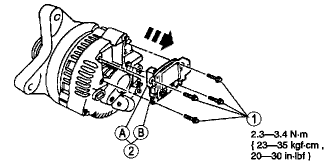 2. Remove the (A) generator brush and terminal holder and the (B) voltage regulator assembly.