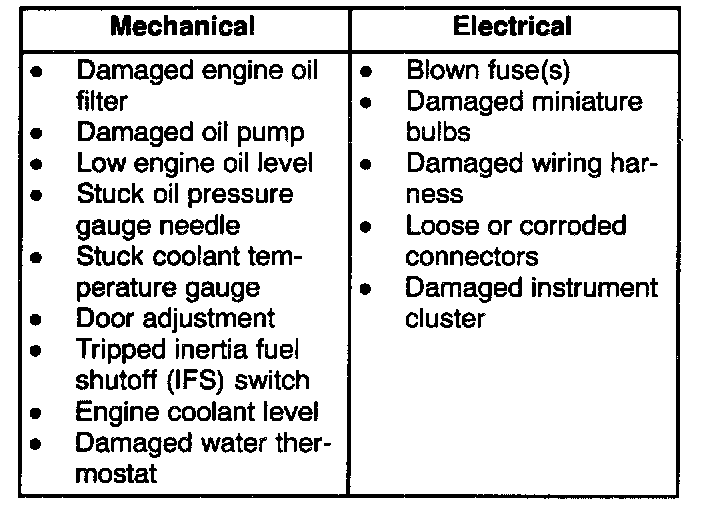 1. Verify the customer concern by operating the system in question.2. Visually inspect the components listed in the following chart.