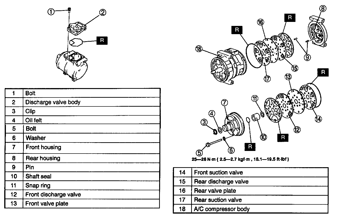 4. Fill the A/C compressor with the same amount of ND-OIL8 compressor oil as was drained before disassembly.