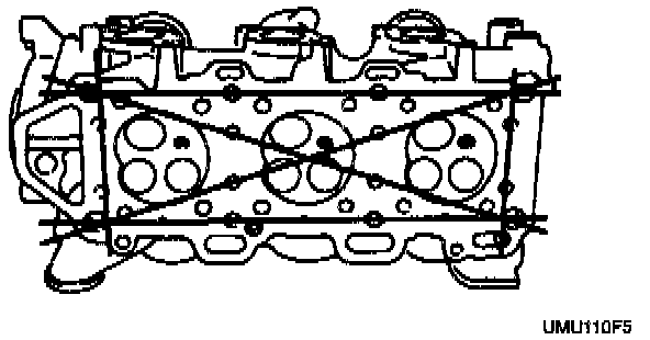 - Using a straightedge, measure the cylinder head for distortion in the six directions as shown in the accompanying image.