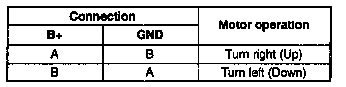 1. Remove the power window motor.2. Apply battery positive voltage to the power window motor connector terminals and check the operation of the motor.