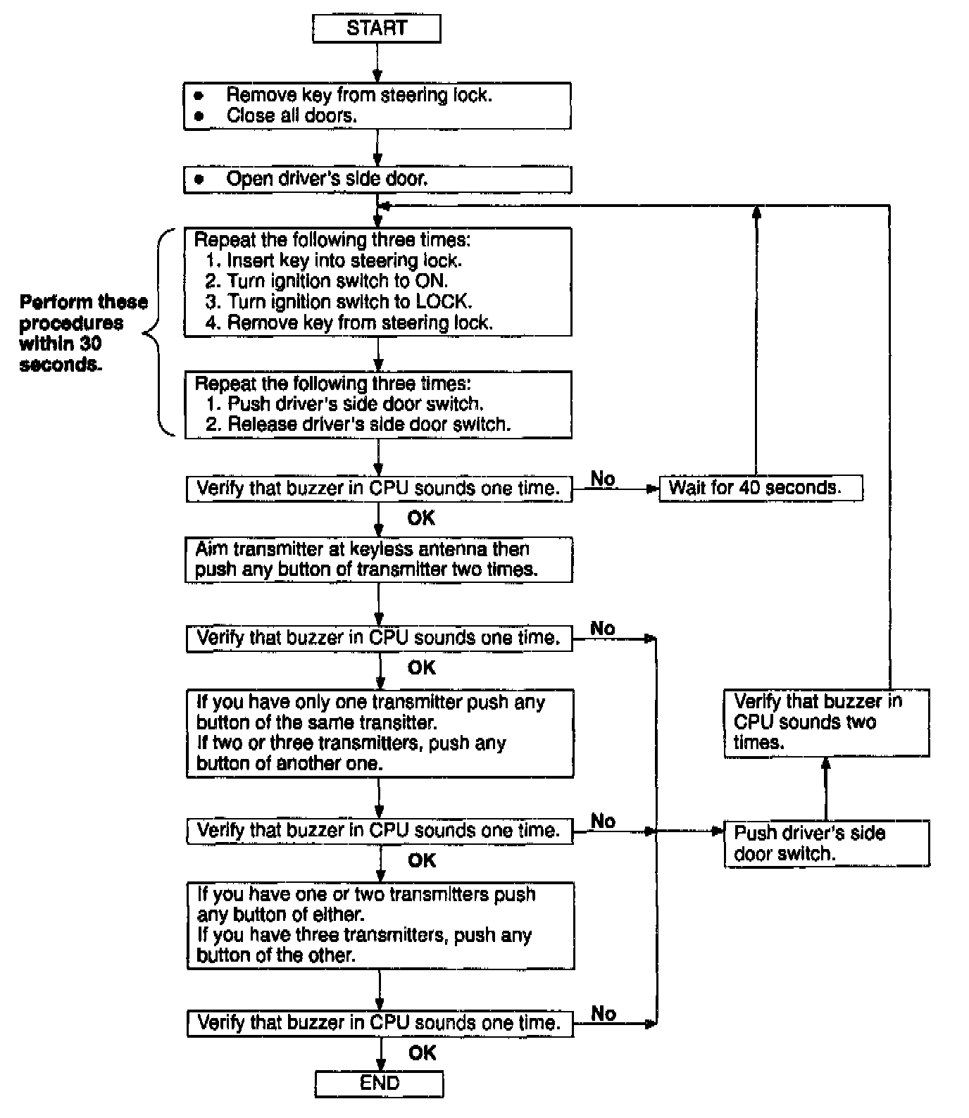 ^ Because up to three ID codes can be programmed into the keyless unit, the vehicle may be stolen with the ID code of an unused transmitter. in order to prevent this, the ID codes for all three transmitters must be reprogrammed when reprogramming an ID code. Also, when one or two transmitters are used, the ID code must be programmed three times with the same transmitter.