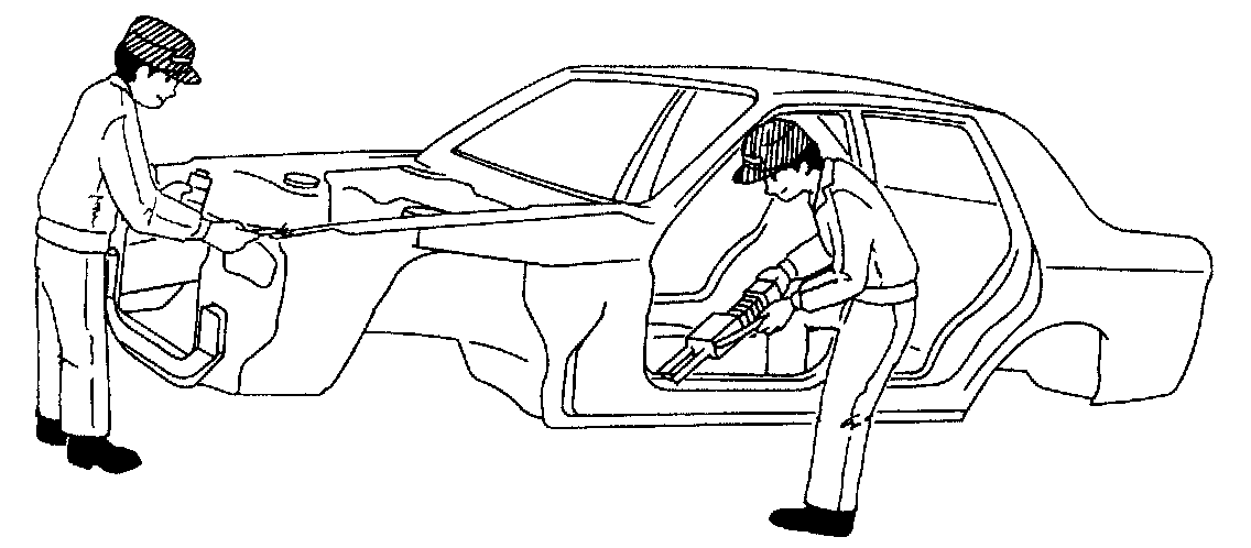 For treatment against corrosion, remove the paint grease, and other material from the portion of the new part and body to be welded, and apply weld- through primer.