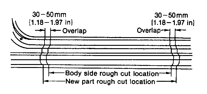 For cut-and-join areas, allow for an overlap of 30-50 mm (1.18-1.97 in} with remaining area in a body side and then rough cut the new part.