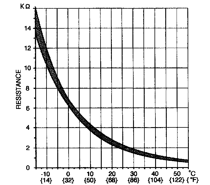 4. If the resistance is not in the shaded zone shown in the graph, replace the ambient temperature sensor.