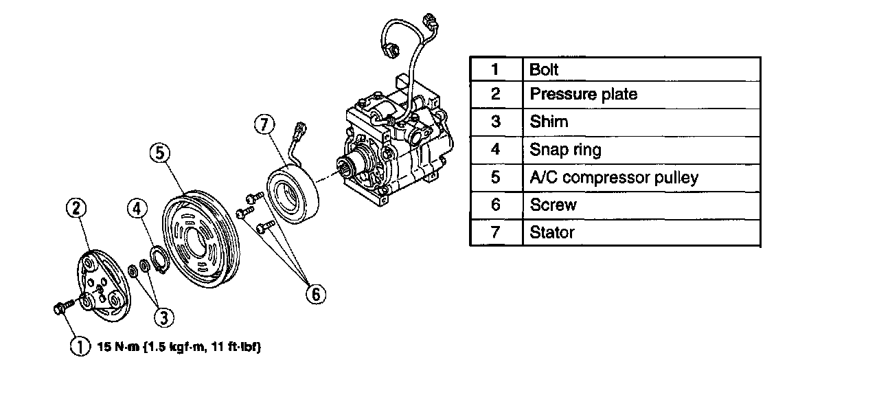 1. Remove the A/C compressor.2. Disassemble in the order indicated in the table.
