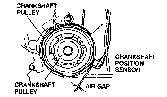 2. Measure the air gap between the crankshaft pulley and the crankshaft position sensor by using a feeler gauge.